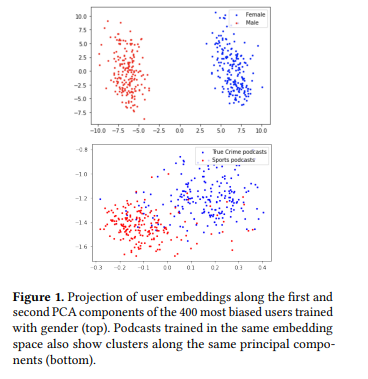200 male and 200 female users with the greatest cosine similarity with our attribute bias vector. We then projected the podcast embeddings onto the vector space learned by PCA applied to the 400 most biased users to observe clustering along the same axis. Since the first principal component was highly correlated with our “bias” vector, we can consider it a proxy for gendered meaning in our podcasts. Therefore, for our feature vectors to have a degree of variation explained by this same vector demonstrates the latent representation of gender in feature vectors.